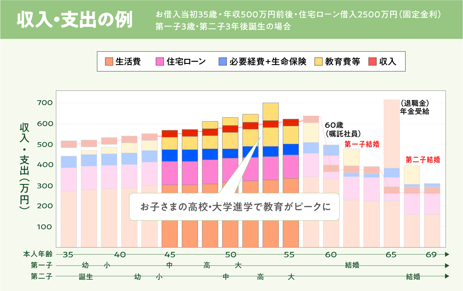| 子供の進学 | 保育園、幼稚園、小学校、中学校、高校、大学…将来の教育費増も考えましょう。 |