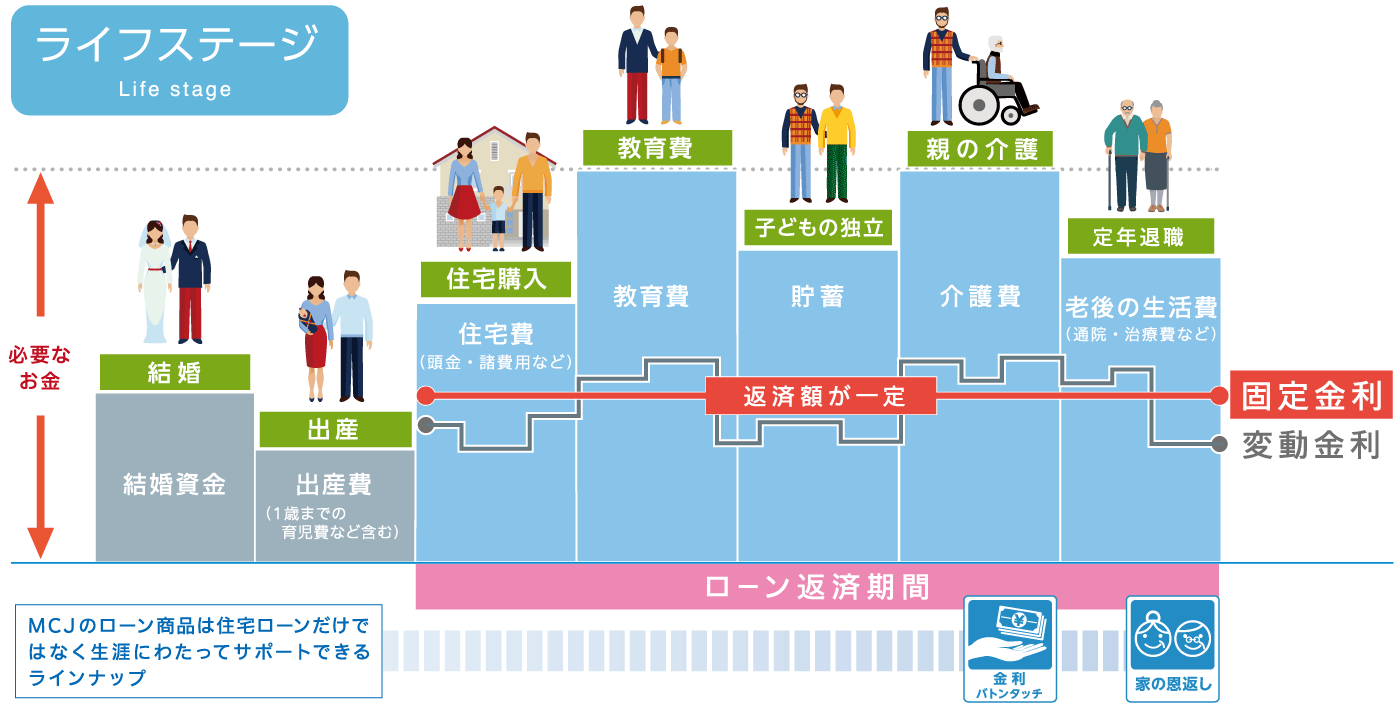 お借入れ時に金利・返済額が決まる「固定金利型」や、金利・返済額が変動するものの、当初返済額を低く抑えられる「変動金利型」まで、ご自身のライフプランにあった住宅ローンをお選びいただけます。